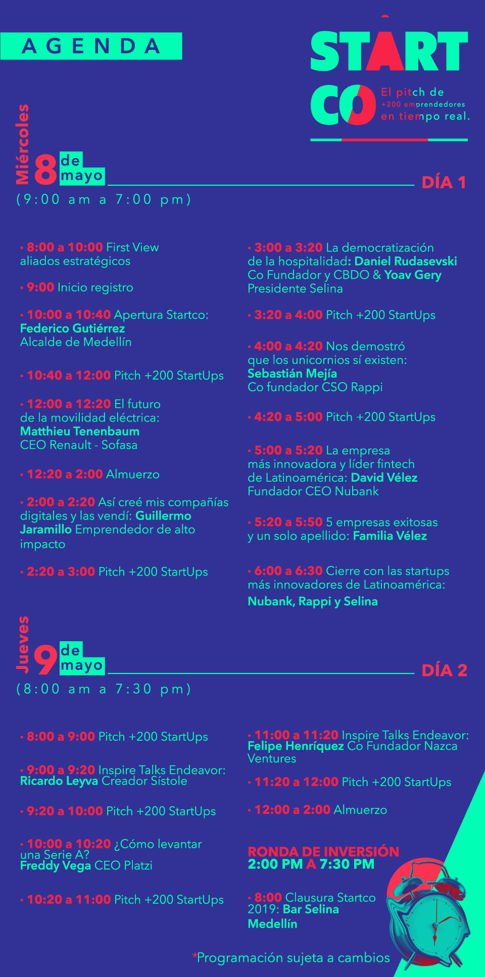 Para generar impacto, contará con una ronda de inversión en vivo, a la cual tendrán acceso los emprendedores mejores calificados por Endeavor y por el público asistente. Los emprendedores de alto impacto e inversionistas destacados que le apuestan a nuevas oportunidades de inversión son entre otros: Miguel Piedrahita, Juan Rodrigo
